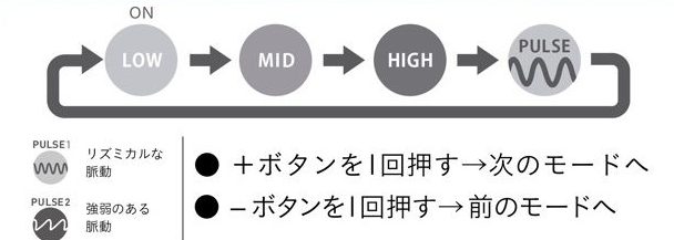 本体裏側に「+ボタン」と「-ボタン」の2つがあります。+は次のモードへ、-は前のモードへ戻るための切り替えボタンで、振動を「High(強)」「Mid(中)」「Low(弱)」と変更できます。さらにこれとは別の「PULSEモード」にすると強弱のある振動を楽しめます。