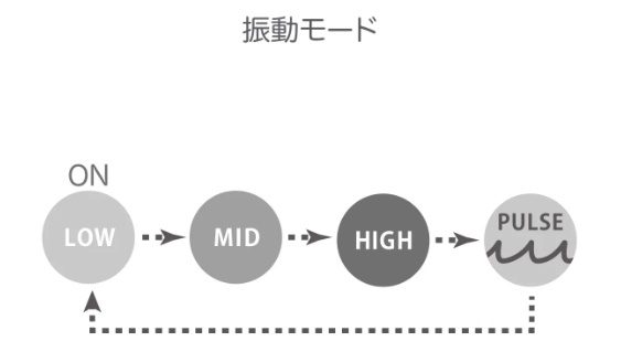 電池を交換したら、再度花マークを長押しして電源を入れます。そして、もう一度花マークを押すと振動が強くなります。「LOW」「MID」「HIGH」の後に振動の強弱が自動で切り替わる「PULSE」へと切り替わります。初心者の方は、まず気持ちよい強さを見つけてください。そして「PULSE」でしっかり快感を楽しんでから、再び自分が見つけた気持ちよい振動でイクとスッキリできるでしょう。