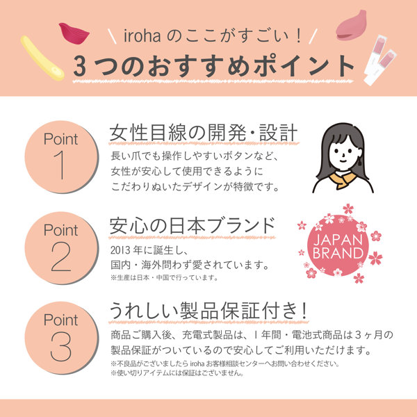 さらに、この手の製品で多いのが、壊れやすいということ。ヘビーユーザーの方には、すぐに壊れるのが当たり前という声さえ耳に入ってきます。ところが、irohaのプレジャーアイテムは保証期間(3か月~1年間)があるのでより長く安心して使用することができるのです。