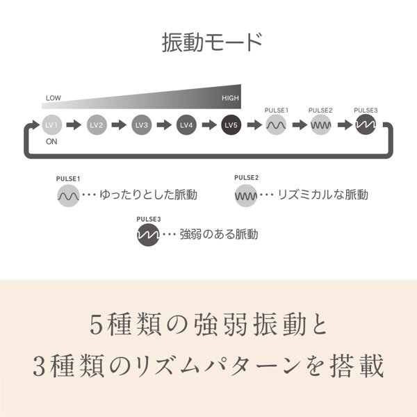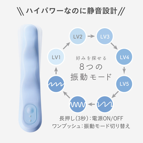 特徴 | 初めてのセルフプレジャーに最適 ふんわりソフトでさらさら、カラダに馴染む ハイパワーなのに静音設計(8つの振動モード) |