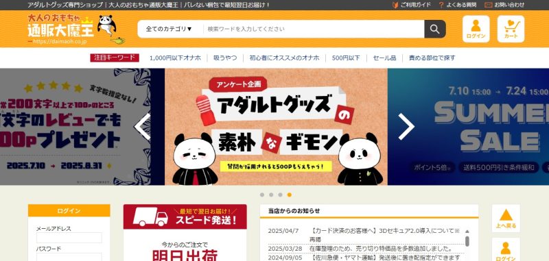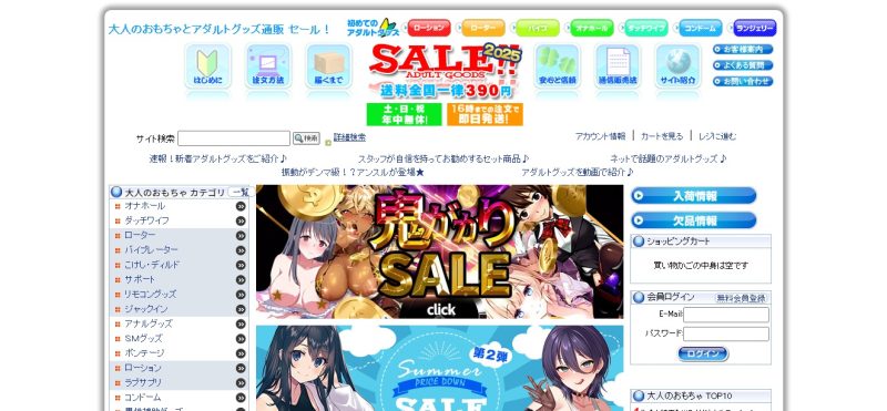 知名度こそ低いものの、価格は業界トップクラスの安さを誇るサイトです。取り扱い商品数も24,800アイテムと十分な品揃え。男性用、女性用ともに充実しているので、FANZAに近い感覚で利用できるサイトです。送料が一律390円という点もありがたいポイントです。ただし、商品説明が簡素化されており、初心者は使用感のイメージが掴みにくいこともあります。