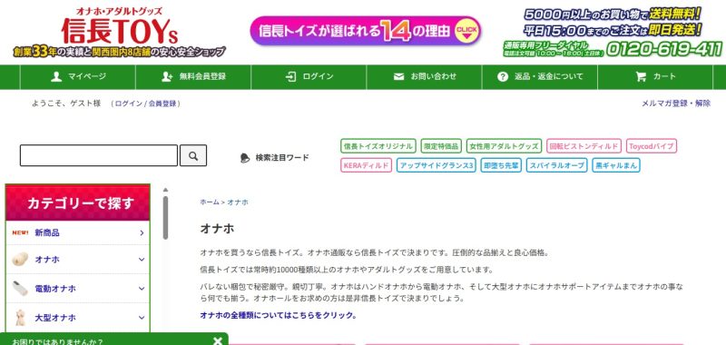 1万アイテム以上のアダルトグッズを取り扱っている信長TOYsは、創業30年を越える老舗のショップです。大阪に実店舗を持っています。オリジナルオナホールやローターも販売しており、マニアックなアナルグッズなども充実。大きいサイズのエロ下着を取り扱っている点も他のサイトにはない魅力といえるでしょう。300円以下で購入できるアダルトグッズも多数販売しています。