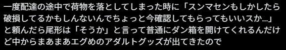 アダルトグッズを通販で購入した方の中には箱の破損が原因で中身の確認を求められたケースもあります。ヤマトや佐川、郵便は規約として中身の破損を確認し、問題がある場合は弁償してくれるルールです。こればかりは運次第ですが、中身がアダルトグッズであっても、業務的に処理してくれるようです。
